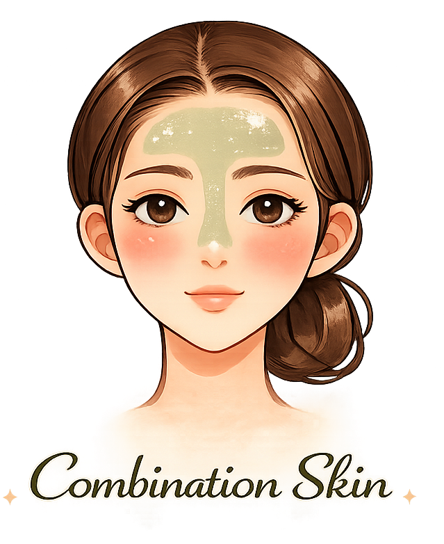 Combination skin includes both oily and dry areas on the face. Typically, the T-zone (forehead, nose, and chin) is oily, while the cheeks may feel normal or dry.